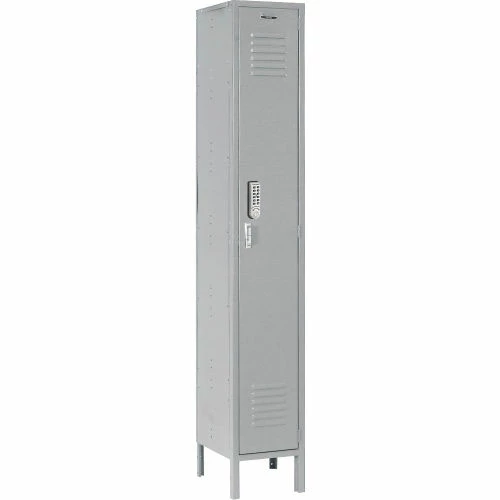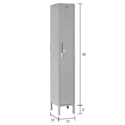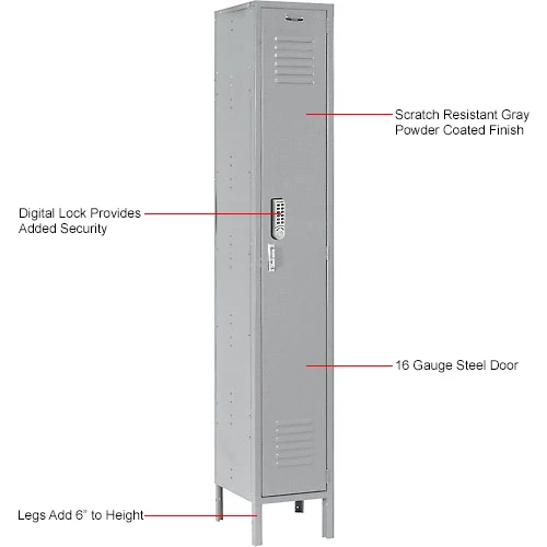 The Global Industrial™ 1-Tier 1 Door Digital Locker is engineered to provide years of heavy-duty service. The locker features 16-gauge steel doors, 5-knuckle security hinge and welded, reinforced frame-and-door assemblies for maximum security. This single tier locker has a secure 3-point positive locking system, hat shelf, chrome door latch and double and single-prong coat hooks. Generously sized louvers promote ventilation. Unit includes the attached Global Industrial™ Electronic Vertical Keypad Lock with Master Key, which easily adds premiere-level security to the locker. Legs add 6″ to height. Durable, attractive powder coat finish. Includes blank number plates. Lockers feature finished sides; no need for decorative end panels. Lockers must be anchored securely to floors. 1-wide and 3-wide lockers have four foot plates included. Foot plates bolt to outside locker leg supports and maybe anchored to the floor. Anchors sold separately.