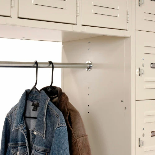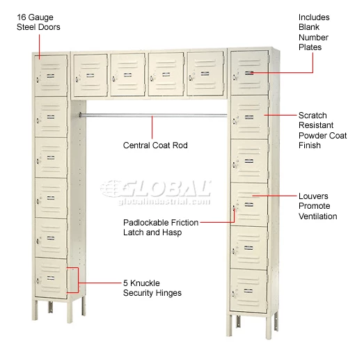 Engineered for years of heavy-duty service. Ideal for use in employee locker rooms and more, 16 box lockers are arranged around a 1″ diameter central coat rod. These lockers feature 16 gauge steel doors, 5-knuckle security hinge and welded, reinforced frame-and-door assemblies for maximum security. These lockers feature a padlockable friction latch and hasp closure. Louvers promote ventilation. Legs add 6″ to height. Durable, attractive powder coat finish. Includes blank number plates. Lockers feature finished sides; no need for decorative end panels. Lockers must be anchored securely to floors. 1-wide and 3-wide lockers have four foot plates included. Foot plates bolt to outside locker leg supports and maybe anchored to the floor. Anchors sold separately.