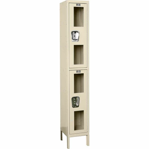 Backed by a 2 Year Limited Warranty. These Premium Security Lockers’ doors permit viewing of contents through transparent, scratch resistant and highly rugged polycarbonate windows engineered specifically for use in school, commercial and factory facilities. Legs add 6″ to height. These Double Tier Locker doors feature steel with polycarbonate windows and are equipped with stainless steel recessed handles and padlockable gravity latches. All steel surfaces are finished in rugged Tan enamel. Recessed handles provide a catch-free surface, discourage tampering with padlocks and protect locker face from padlock wear. These lockers include 1 double prong hook and 2 single wall hooks per compartment.