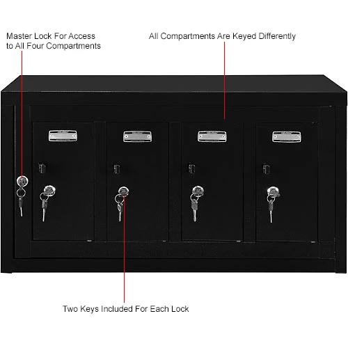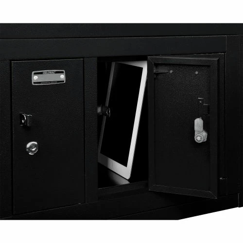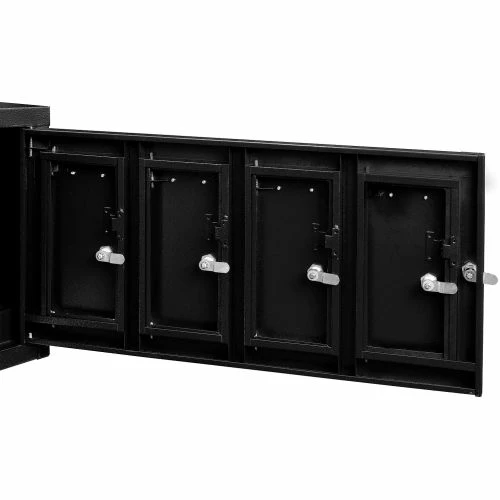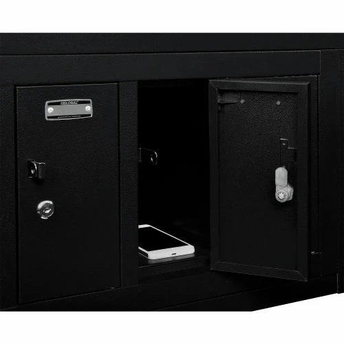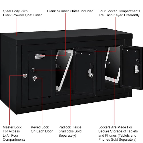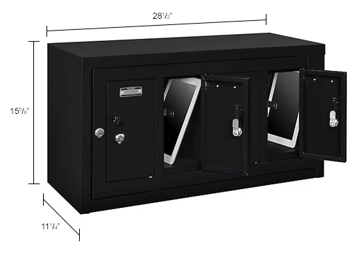 Cell Phone Storage Lockers Provide A Convenient, Secure, Space Saving Solution For Storing Electronic Devices Safely. Cell Phone Lockers are made of 21 gauge steel doors and 20 gauge body with black powder coat finish for long lasting durability. Mounted to the wall for ease of use, or placed on any flat surface, suggested to fasten to a wall to prevent tipping. Lockers equipped both padlockable hasp (padlock sold separately) and key lock provide high security. 4 sets of 2 keys per door; each door is keyed differently. Management has master key set to allow immediate access to all locker compartments as needed. Cell phone lockers are ideal for military facilities, law enforcement, government contractors, fitness clubs, swimming pools, health care and schools to securely store cell phones, tablets, wallets, sun glasses, keys and other personal items. Blank metal number plates, hardware and mounting brackets included. Ships fully assembled.