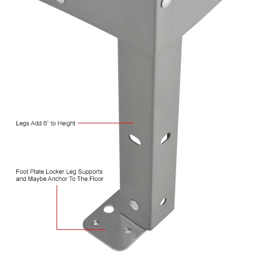 Engineered for years of heavy-duty service. These lockers feature 16 gauge steel doors, 5-knuckle security hinge and welded, reinforced frame-and-door assemblies for maximum security. These four tier lockers feature a padlockable friction latch and hasp closure. Louvers promote ventilation. Legs add 6″ to height. Durable, attractive powder coat finish. Includes blank number plates. Lockers feature finished sides; no need for decorative end panels. Lockers must be anchored securely to floors. 1-wide and 3-wide lockers have four foot plates included. Foot plates bolt to outside locker leg supports and maybe anchored to the floor. Anchors sold separately.