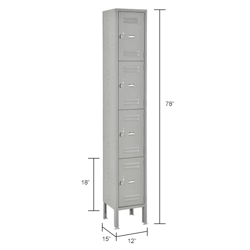 Engineered for years of heavy-duty service. These lockers feature 16 gauge steel doors, 5-knuckle security hinge and welded, reinforced frame-and-door assemblies for maximum security. These four tier lockers feature a padlockable friction latch and hasp closure. Louvers promote ventilation. Legs add 6″ to height. Durable, attractive powder coat finish. Includes blank number plates. Lockers feature finished sides; no need for decorative end panels. Lockers must be anchored securely to floors. 1-wide and 3-wide lockers have four foot plates included. Foot plates bolt to outside locker leg supports and maybe anchored to the floor. Anchors sold separately. 1 Year Limited Warranty.