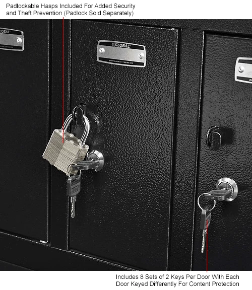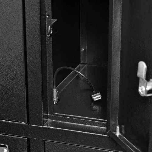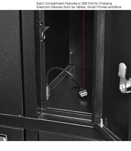 Cell Phone Storage Charging Lockers Provide A Convenient, Secure, Space Saving Solution For Storing Electronic Devices Safely. Cell Phone Lockers are made of 21 gauge steel doors and 20 gauge body with black powder coat finish for long lasting durability. Inside each of the compartment has a USB port for charging tablets, smart phones and other electronics by using user’s own charging cable. The USB port connects to a 110V outlet, each port’s output is 2.0 amps Max. to charge away. Mounted to the wall for ease of use. Lockers equipped both padlockable hasp (padlock sold separately) and key lock provide high security. 8 sets of 2 keys per door; each door is keyed differently. Management has master key set to allow immediate access to all locker compartments as needed.