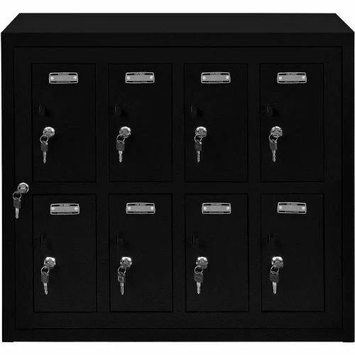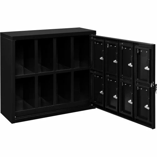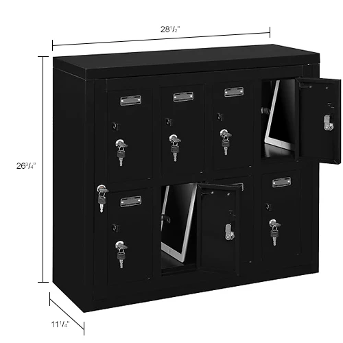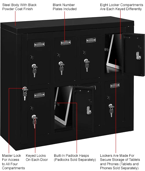 Cell Phone Storage Lockers Provide A Convenient, Secure, Space Saving Solution For Storing Electronic Devices Safely. Cell Phone Lockers are made of 21 gauge steel doors and 20 gauge body with black powder coat finish for long lasting durability. Mounted to the wall for ease of use, or placed on any flat surface, suggested to fasten to a wall to prevent tipping. Lockers equipped both padlockable hasp (padlock sold separately) and key lock provide high security. 8 sets of 2 keys per door; each door is keyed differently. Management has master key set to allow immediate access to all locker compartments as needed. Cell phone lockers are ideal for military facilities, law enforcement, government contractors, fitness clubs, swimming pools, health care and schools to securely store cell phones, tablets, wallets, sun glasses, keys and other personal items. Blank metal number plates, hardware and mounting brackets included. Ships fully assembled.