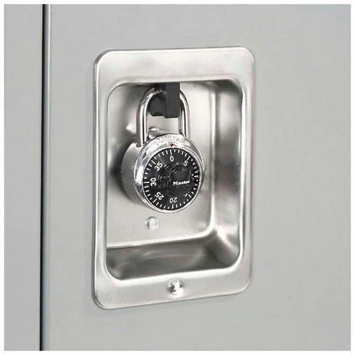 Door handle with fingertip lift latch is recessed into the door face to create a smooth catch-free surface, to discourage the padlock from being cut off and to provide a neat, clean look. The results are improved safety, security and appearance. These quality lockers feature 16 gauge steel doors, 5-knuckle security hinge and welded, reinforced frame-and-door assemblies. Extra wide louvers promote ventilation. Lockers must be anchored securely to floors. 1-wide and 3-wide lockers have four foot plates included. Foot plates bolt to outside locker leg supports and maybe anchored to the floor. Anchors sold separately. Legs add 6″ to height. Includes blank number plates. Lockers have secure 3-point positive locking system, hat shelf, stainless steel door latch and double and single-prong coat hooks (the 18″ deep model also includes a coat rod).