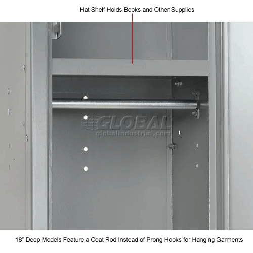 Lockers have secure 3-point positive locking system, hat shelf, stainless steel door latch and one double and two single-prong coat hooks (the 18″ deep model also includes a coat rod). Includes blank number plates. Assembled lockers are not returnable.