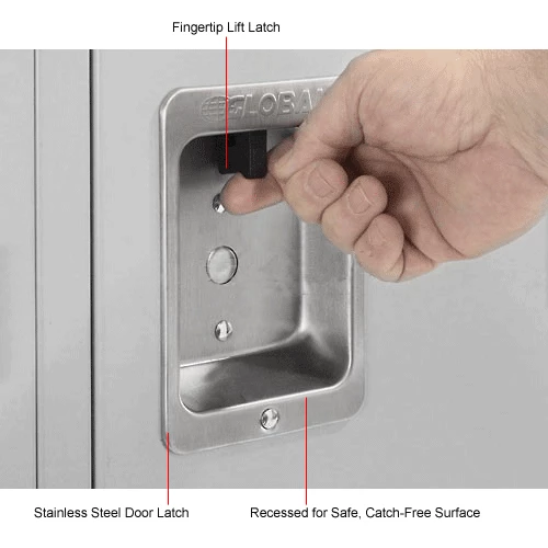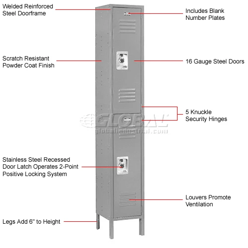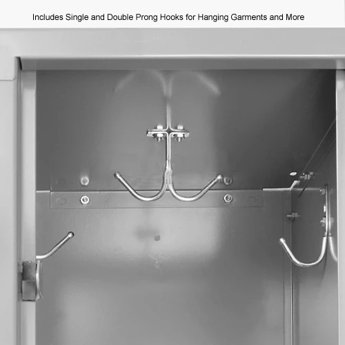 Lockers have secure 3-point positive locking system, hat shelf, stainless steel door latch and one double and two single-prong coat hooks. Includes blank number plates. Assembled lockers are not returnable.