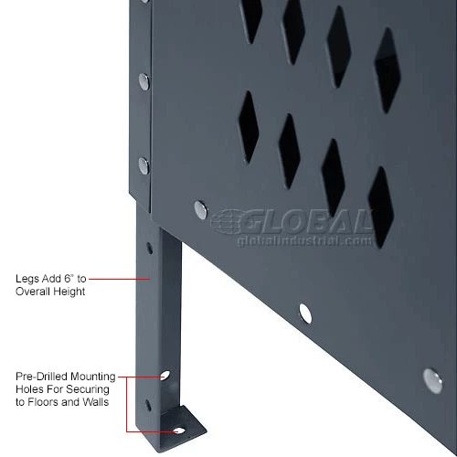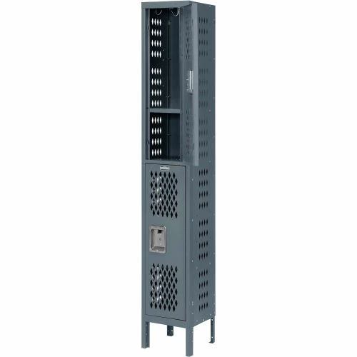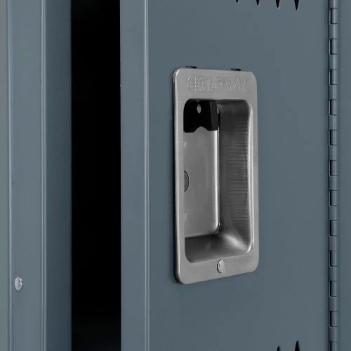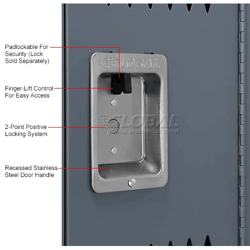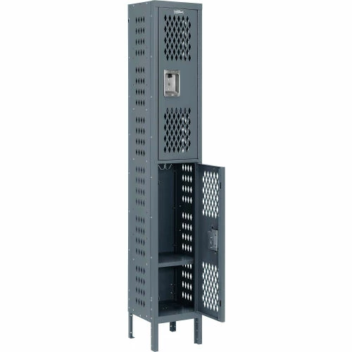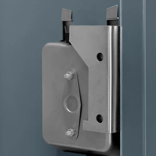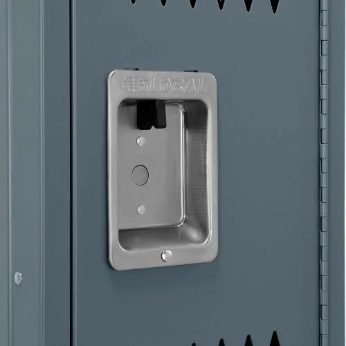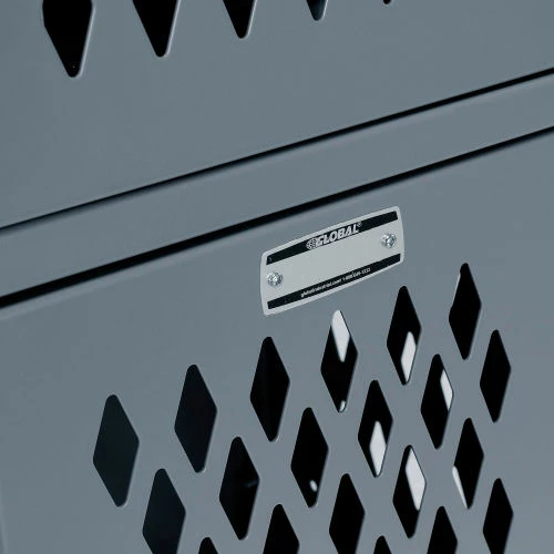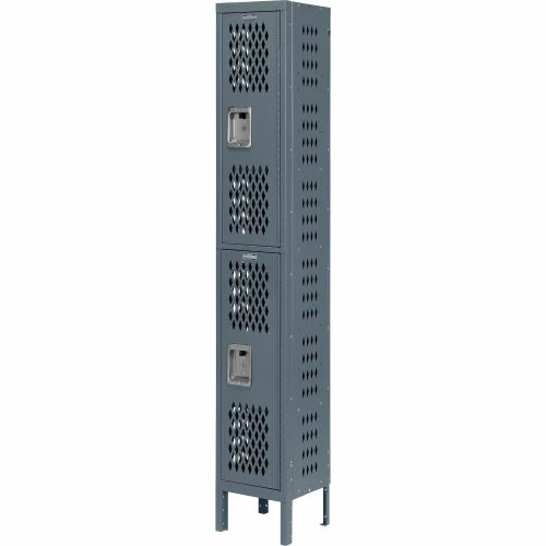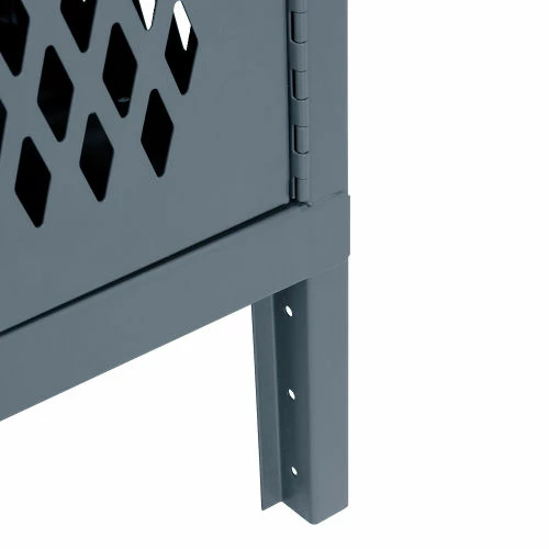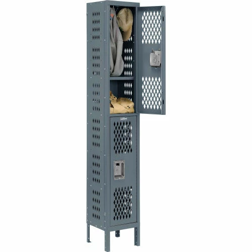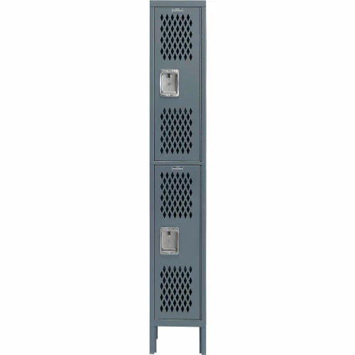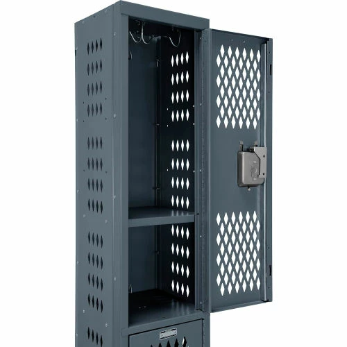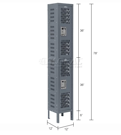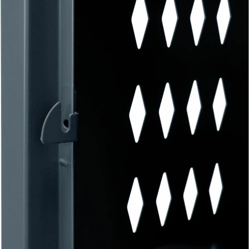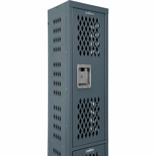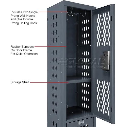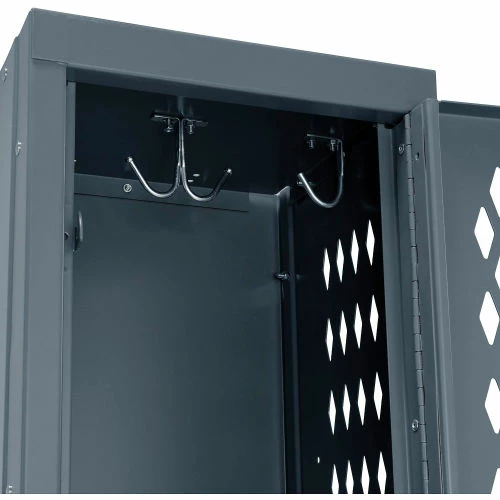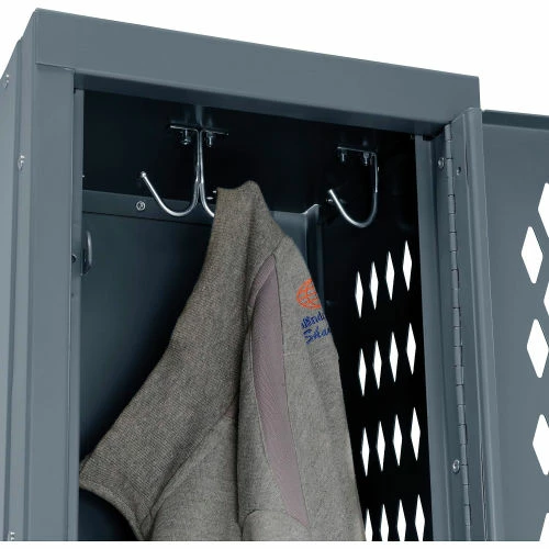 Ventilated lockers are made using heavy 16 gauge steel with diamond shaped perforations for improved airflow. Locker doors feature rubber bumpers on framing to ensure quiet operation. Continuous piano hinges provide maximum security. Recessed handle and finger-lift control creates a clean, neat appearance. Lockers include blank number plates. Gray Powder coat color finishes. Steel lockers feature finished sides; no need for decorative end panels. Double Tier Steel Gym Lockers have secure 2-point positive locking system, stainless steel door latch and double and single-prong coat hooks.