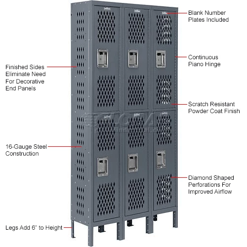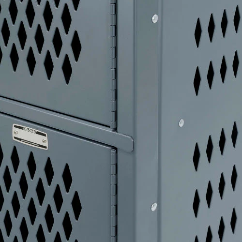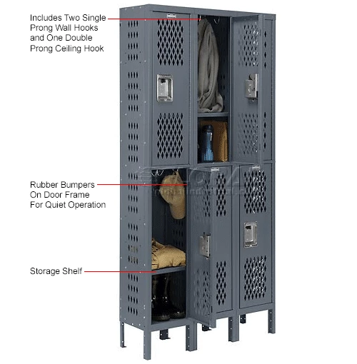 Ventilated lockers are made using heavy 16 gauge steel with diamond shaped perforations for improved airflow. Locker doors feature rubber bumpers on framing to ensure quiet operation. Continuous piano hinges provide maximum security. Recessed handle and finger-lift control creates a clean, neat appearance. Lockers include blank number plates. Gray Powder coat color finishes. Steel lockers feature finished sides; no need for decorative end panels. Double Tier Steel Gym Lockers have secure 2-point positive locking system, stainless steel door latch and double and single-prong coat hooks.