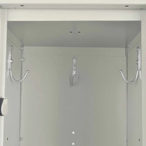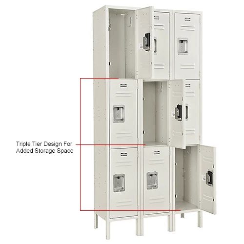 Engineered for years of heavy-duty service. These lockers feature 16 gauge steel doors, 5-knuckle security hinge and welded, reinforced frame-and-door assemblies for maximum security. These triple tier lockers have a secure 2-point positive locking system and double and single-prong coat hooks. Generously sized louvers promote ventilation. Legs add 6″ to height. Durable, attractive powder coat finish. Includes blank number plates. Lockers feature finished sides; no need for decorative end panels. Lockers must be anchored securely to floors. Optional locker accessories (Numbered Plates, Closed End Bases, Slope Top Kits and Locks) sold separately. 1-wide and 3-wide lockers have four foot plates included. Foot plates bolt to outside locker leg supports and maybe anchored to the floor. Anchors sold separately.