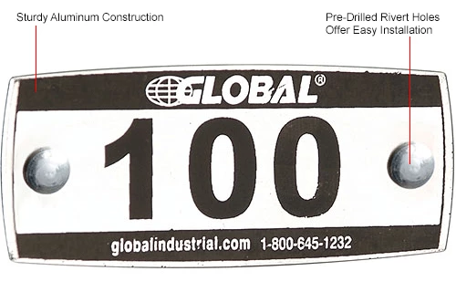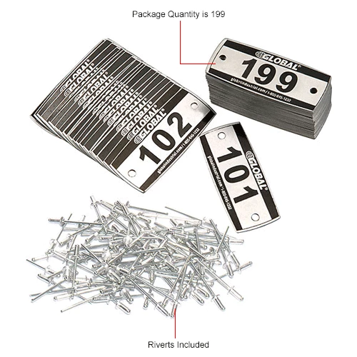 Locker numbered aluminum plates for identification and organization. Pre-drilled river holes for easy installation. Rivets included. Used for Global Paramount, Infinity and Capital lockers. Includes 199 plates, numbered 101-299. Aluminum with black lettering. 1 Year Limited Warranty.