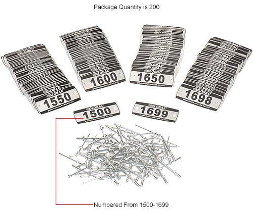 Locker numbered aluminum plates for identification and organization. Pre-drilled rivet holes for easy installation. Rivets included. Used for Global Paramount, Infinity and Capital lockers. Includes 200 plates, numbered 1500-1699. Aluminum with black Lettering. Measures 2-1/4″ x 7/8″.