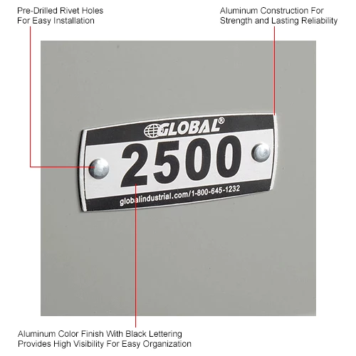Locker numbered aluminum plates for identification and organization. Pre-drilled rivet holes for easy installation. Rivets include. Used for Global Paramount, Infinity and Capital lockers. Includes 200 plates, numbered 2500-2699. Aluminum with black Lettering. Measures 2-1/4″ x 7/8″.
