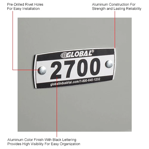 Locker numbered aluminum plates for identification and organization. Pre-drilled rivet holes for easy installation. Rivets included. Used for Global Paramount, Infinity and Capital lockers. Includes 200 plates, numbered 2700-2899. Aluminum with black Lettering. Measures 2-1/4″ x 7/8″.