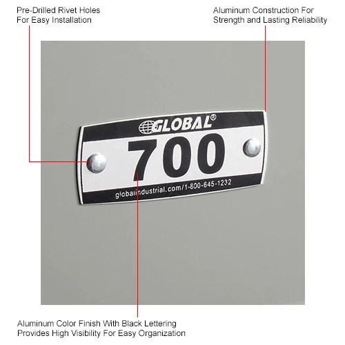 Locker numbered aluminum plates for identification and organization. Pre-drilled rivet holes for easy installation. Rivets included. Used for Global Paramount, Infinity and Capital lockers. Includes 200 plates, numbered 700-899. Aluminum with black Lettering. Measures 2-1/4″ x 7/8″.