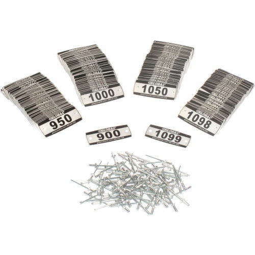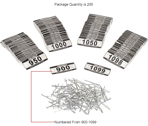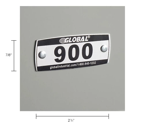 Locker numbered aluminum plates for identification and organization. Pre-drilled rivet holes for easy installation. Rivets included. Used for Global Paramount, Infinity and Capital lockers. Includes 200 plates, numbered 900-1099. Aluminum with black Lettering. Measures 2-1/4″ x 7/8″.