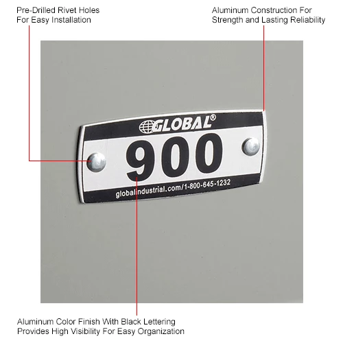 SKU: Global Industrial WB493411C Categories: Locker Accessories, Locker Number Plates, Storage Accessories Tags: 200, 493411C, Aluminum, Assembled, Global Industrial, Number Plate, Numbered 900-1099, Storage & Shelving