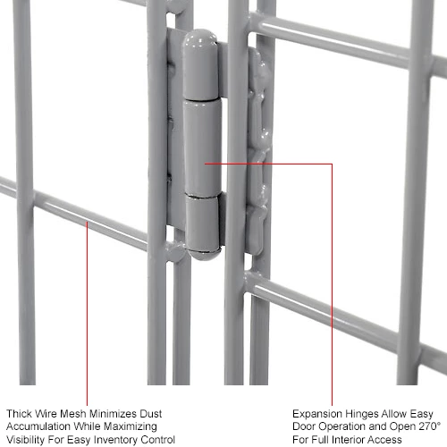 Ventilated Wide Span Bulk Storage Lockers are made with a 3″ x 3″ x 1/4″ thick wire mesh with gray epoxy finish to minimize dust accumulation and maximize visibility for simple inventory control. Lockers include one height-adjustable shelf with 100 lb. capacity evenly distributed. Shelf adjusts in 3″ increments. Improved latch design to accept padlock. For enhanced security, install shelf at center position to allow use of included padlock. Double doors are welded to side panels and are flush against unit top. Door hinges swing open 270° for full access to interior. Easy assembly. Choose from a variety of sizes. Additional shelves sold separately.
