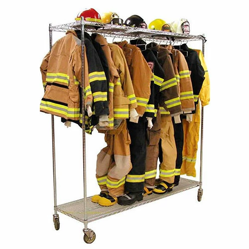 - Rack stores sixteen sets of bunker pants and turnout coats on sixteen Flat Dry hangers with one inch drop.