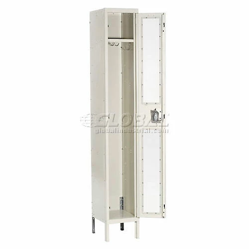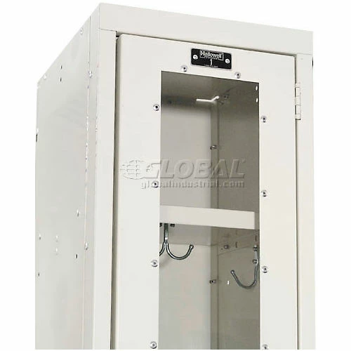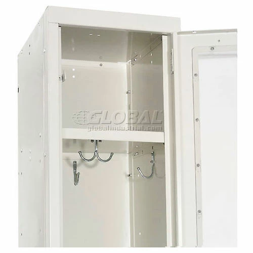 Backed by a 2 Year Limited Warranty. These Premium Security Lockers’ doors permit viewing of contents through transparent, scratch resistant and highly rugged polycarbonate windows engineered specifically for use in school, commercial and factory facilities. Legs add 6″ to height. These Single Tier Locker doors feature steel with polycarbonate windows and are equipped with stainless steel recessed handles and padlockable gravity latches. All steel surfaces are finished in rugged Tan enamel. Recessed handles provide a catch-free surface, discourage tampering with padlocks and protect locker face from padlock wear. These lockers include a hat shelf, 1 double prong hook and 3 single wall hooks.