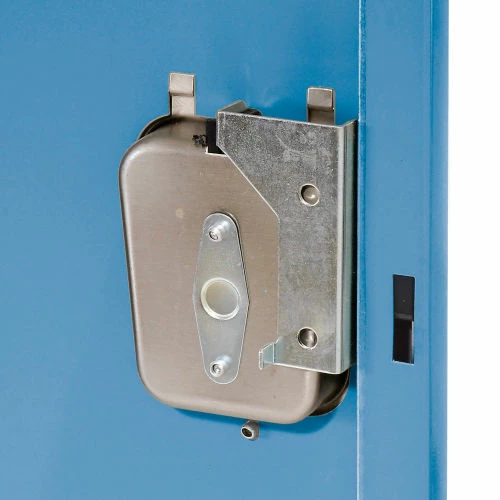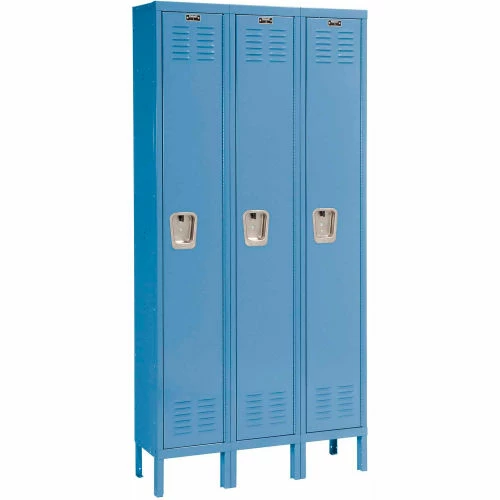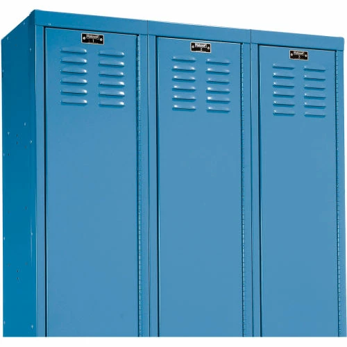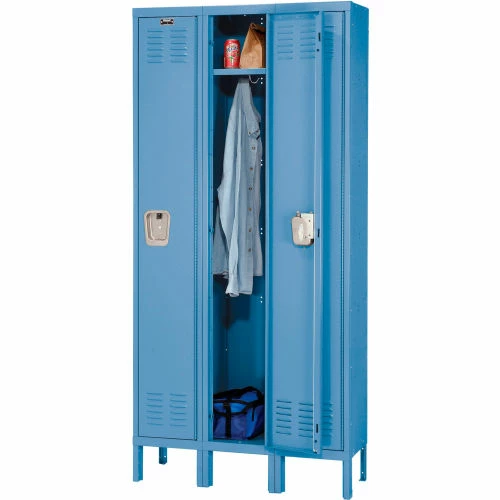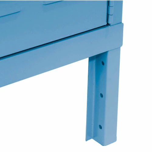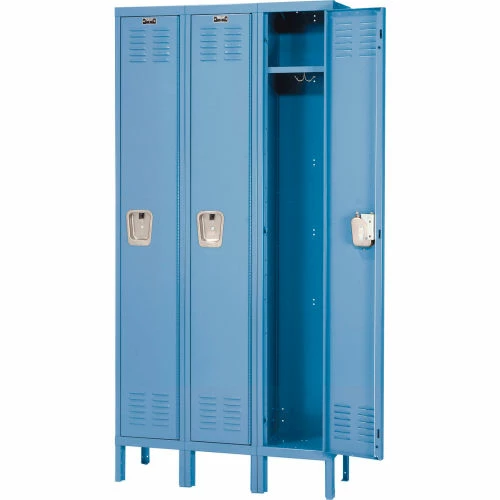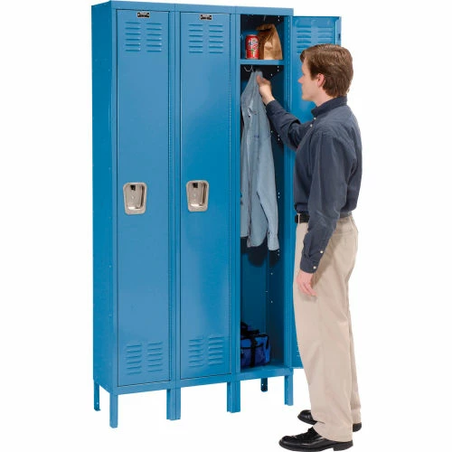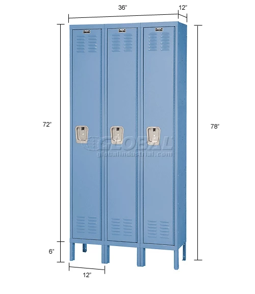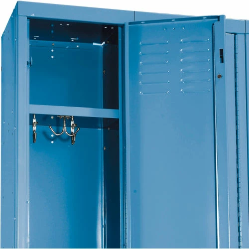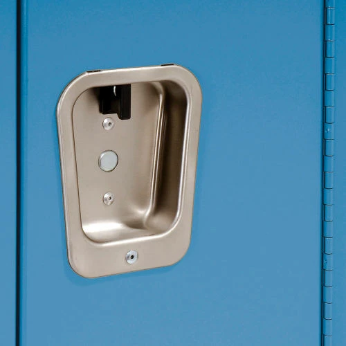 These high quality single tier lockers have louvered 16 gauge steel doors with a stainless steel recessed handle and fingertip lift lever that operates the secure latching mechanism. The smooth front profile of the recessed handle prevents catching and banging. The handle also includes an integral padlock hasp that shelters lock shackle to discourage tampering. Includes a hat shelf and coat hooks. Painted inside and out with powder coat finish. Legs add 6″ to height. Each door includes a number plate.