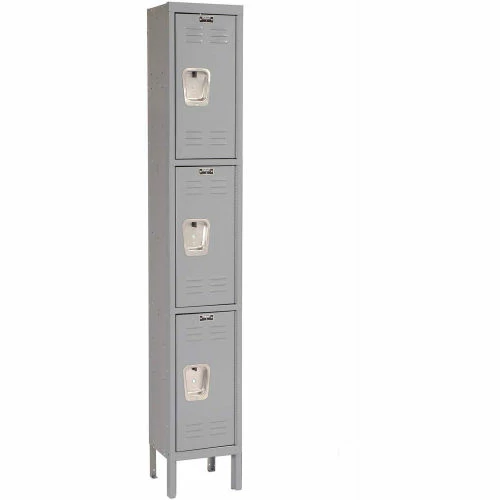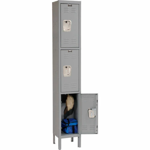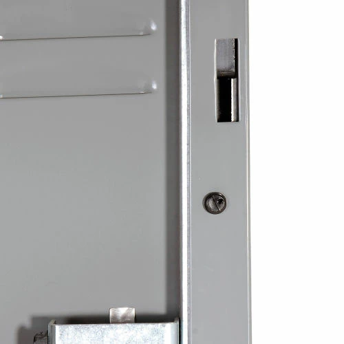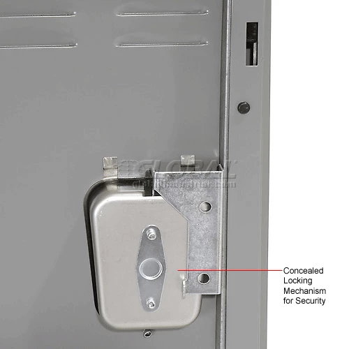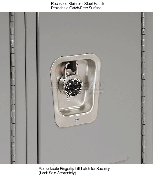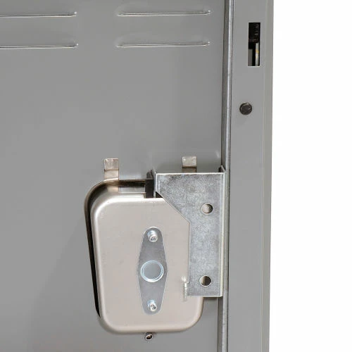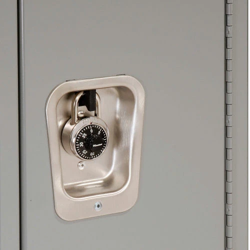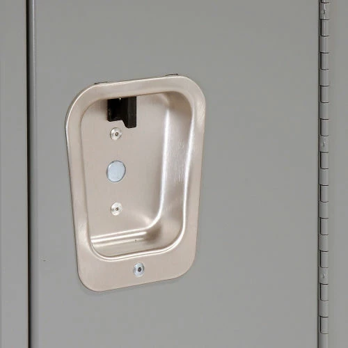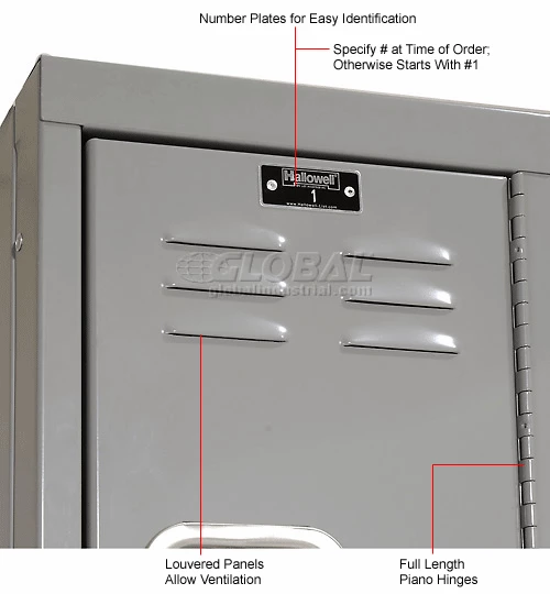 These high quality double tier lockers have louvered 16 gauge steel doors with a stainless steel recessed handle and fingertip lift lever that operates the secure latching mechanism. The smooth front profile of the recessed handle prevents catching and banging. The handle also includes an integral padlock hasp that shelters lock shackle to discourage tampering. Includes coat hooks. Painted inside and out with powder coat finish. Legs add 6″ to height. Each door includes a number plate.
