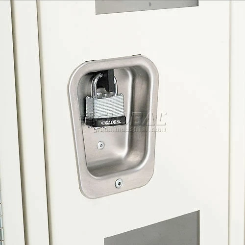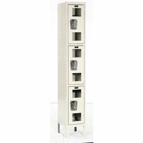 Backed by a 2 Year Limited Warranty. These Premium Security Lockers’ doors permit viewing of contents through transparent, scratch resistant and highly rugged polycarbonate windows engineered specifically for use in school, commercial and factory facilities. Legs add 6″ to height. These Triple Tier Locker doors feature steel with polycarbonate windows and are equipped with stainless steel recessed handles and padlockable gravity latches. All steel surfaces are finished in rugged Tan enamel. Recessed handles provide a catch-free surface, discourage tampering with padlocks and protect locker face from padlock wear. These triple tier lockers are ideal for added storage of personal items where space is limited.