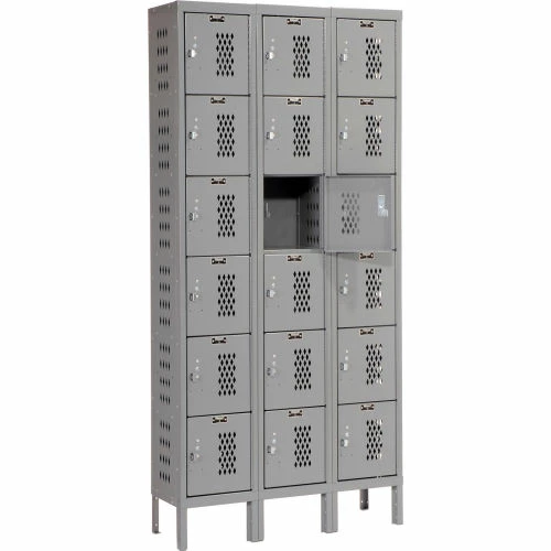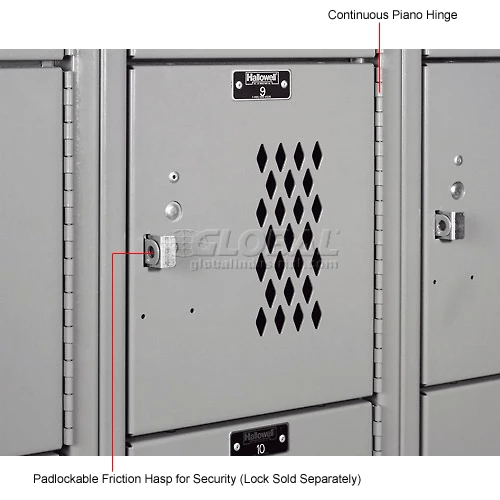 Durable, ventilated lockers combine security, visibility and maximum air circulation. Heavy 14 gauge steel doors and 16 gauge sides have diamond shaped perforations for improved airflow. Rubber bumpers on doorframe ensure quiet operation. Legs allow easy access and add 6″ to overall height. Includes number plates on each door. Six tier box lockers feature a padlock friction hasp. Powder coat finish.