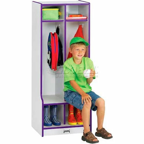 Two section locker with step for sitting. Four double coat hooks. 20″ wide x 17½” deep x 50½” high.