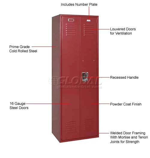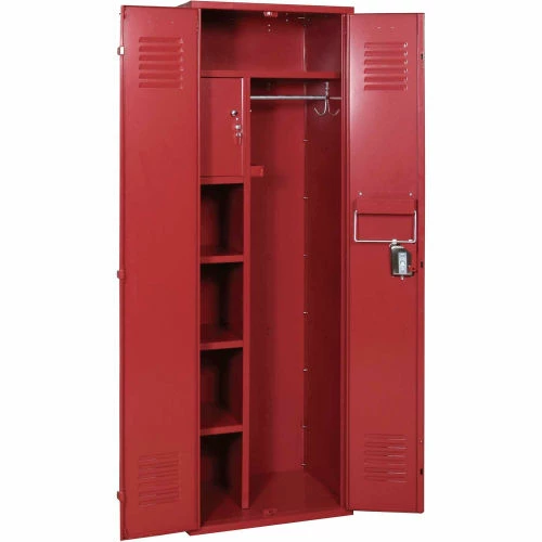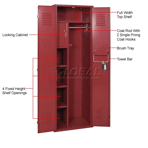 Executive lockers are 24″ wide to provide extra storage space for various applications. Executive lockers provide optimum storage space for all your locker room needs. Perfect for gyms, spas and other locker room facilities with showers. Steel lockers are made from prime grade cold rolled steel. Welded door frames feature mortise and tenon construction for strength. 16 gauge steel doors are louvered for ventilation and use 5-knuckle hinges for increased strength. Recessed handle offers quick and easy door operation using spring-loaded latch clips. Latch channels feature unique nylon glides and latch hooks include rubber bumpers to reduce noise and offer quiet operation. Executive lockers feature a full width top shelf and an option combination brush tray and towel bar (sold separately). Left storage compartment includes a locking cabinet and 4 open fixed height shelves. Right storage compartment includes 2 single prong coat hooks and a garment bar for wardrobe storage. Includes number plates; Note: Specify number at time of order. Powder coat finish. Easy assembly.
