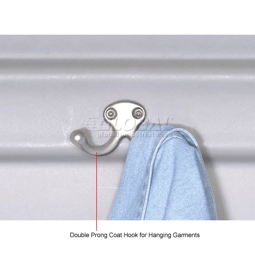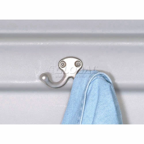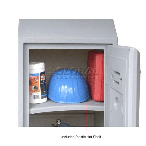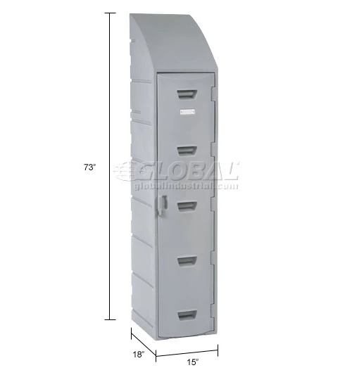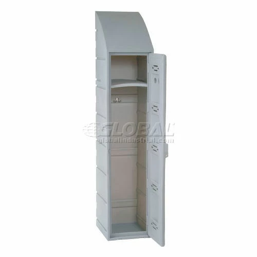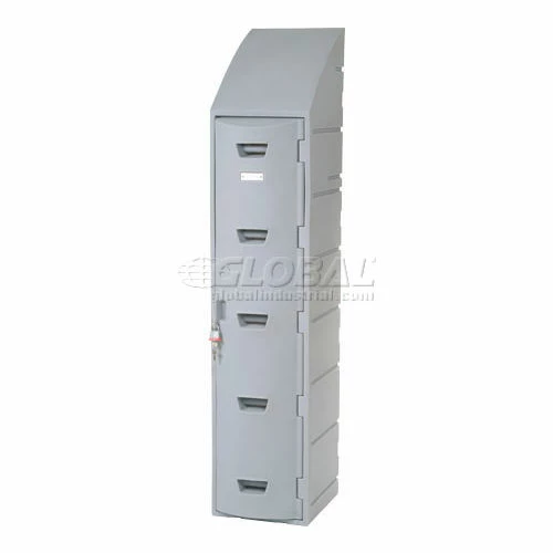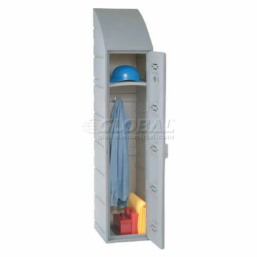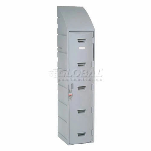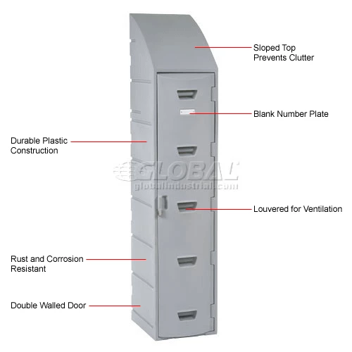 Rugged plastic lockers withstand food service wash-downs and are ideal for damp conditions like pools or ice rinks because they cannot rust or corrode. Because they also operate quietly, they’re ideal for schools. Includes louvers, double-walled doors and a number plate. This single tier model also includes a double coat hook, plastic hat shelf and sloped top. Gray color.
